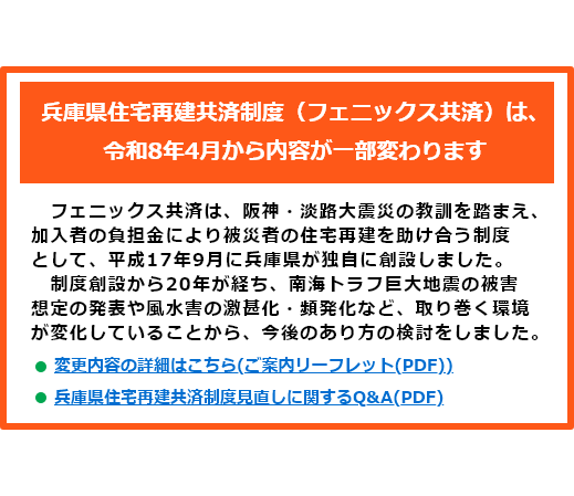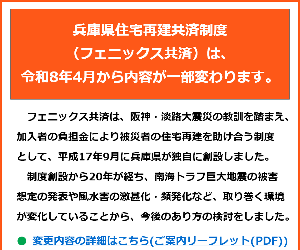 フェニックス共済運営に係る「兵庫県住宅再建共済制度条例」の一部改正条例が令和7年12月15日に公布され、令和8年4月1日から施行されます。これに伴い、「兵庫県住宅再建共済制度約款」、「兵庫県家財再建共済制度約款」及び「兵庫県マンション共用部分再建共済制度約款」も一部改正を行い、令和8年4月1日から施行します。